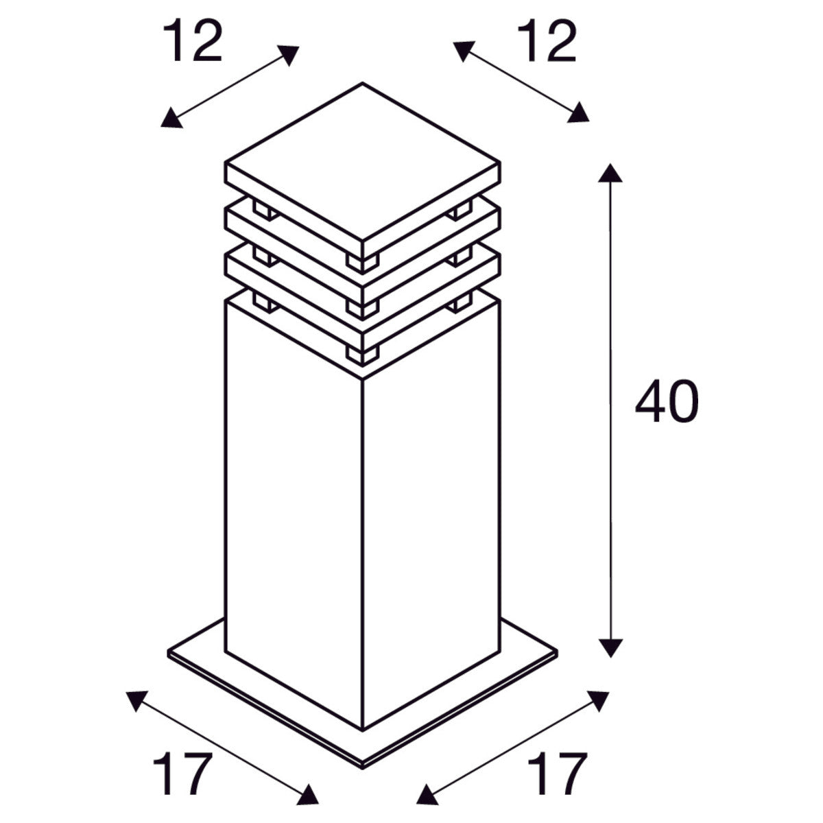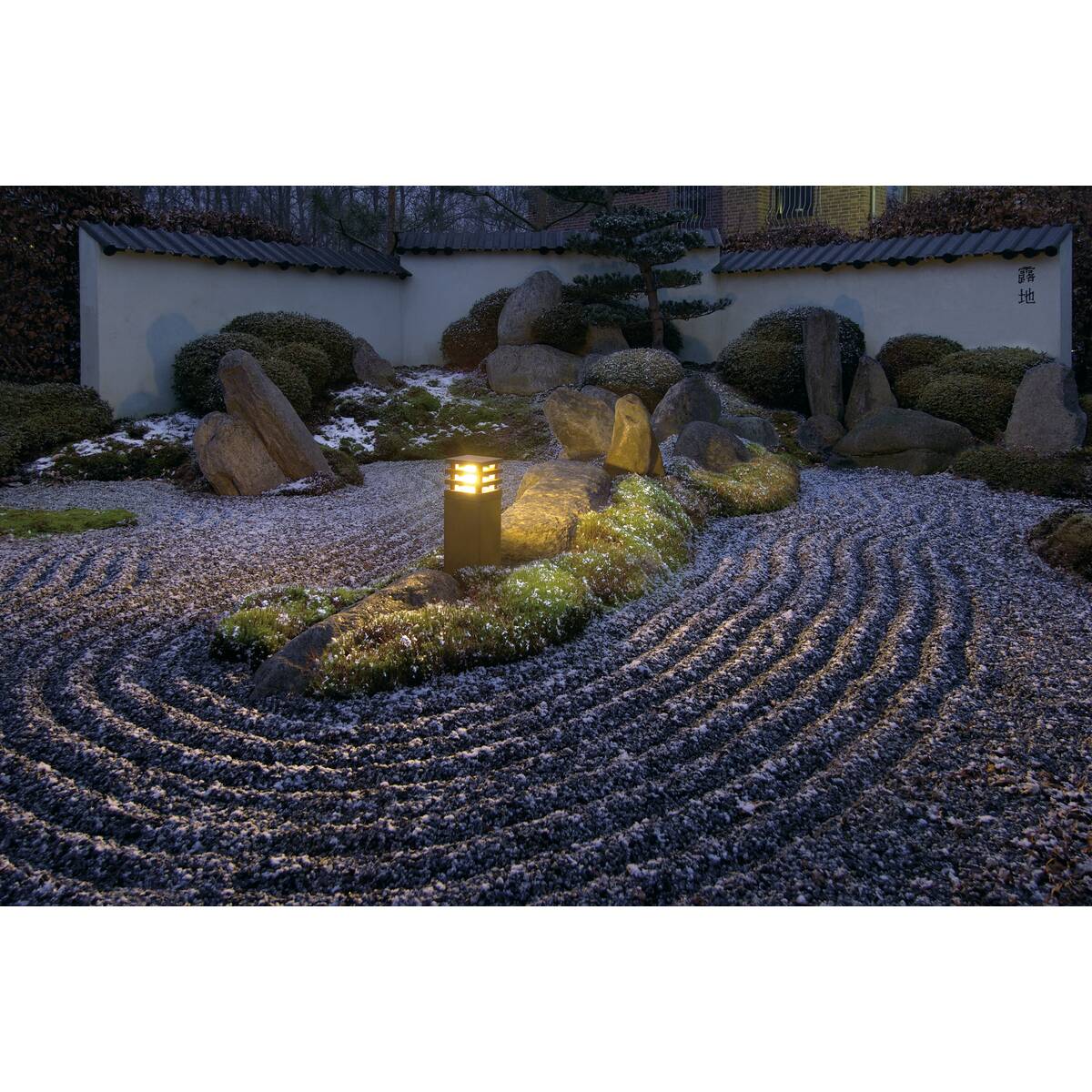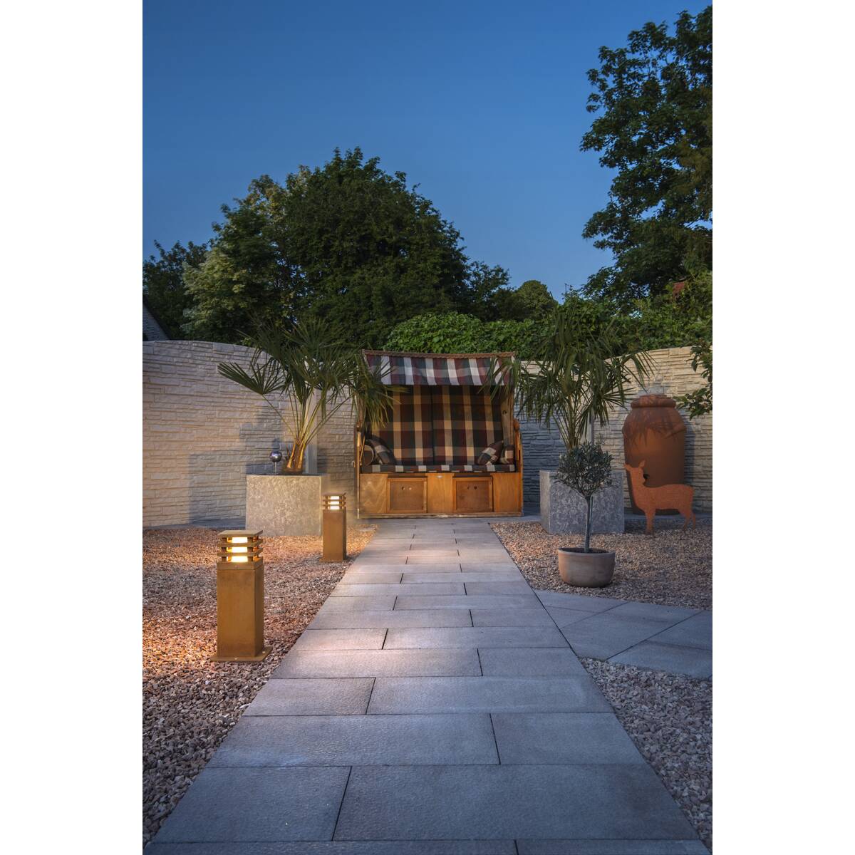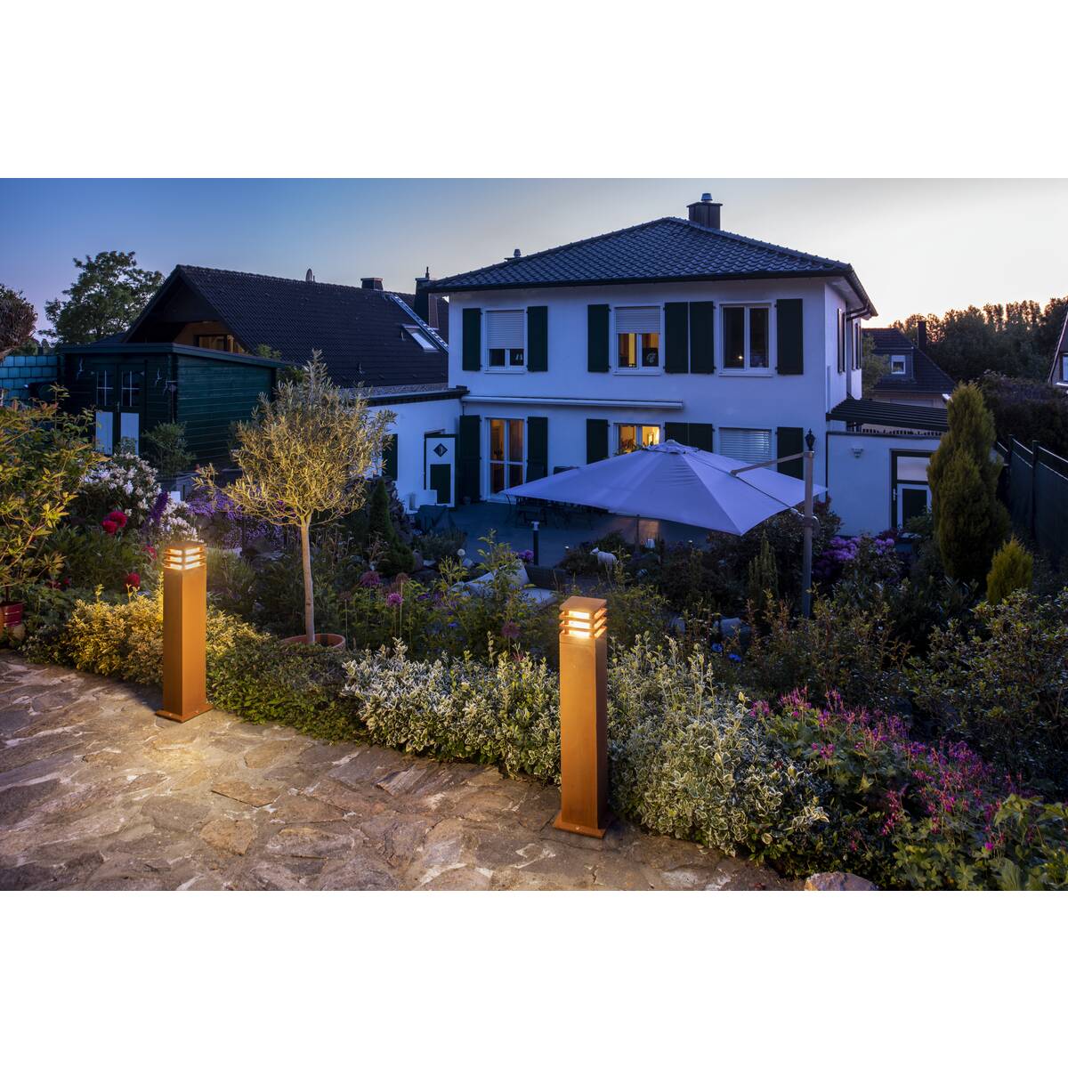 Baliza de jardín en fundición de hierro FeCSi oxidado, sin mantenimiento, resistente al vandalismo y a la intemperie con un grado de protección para exterior de IP55.