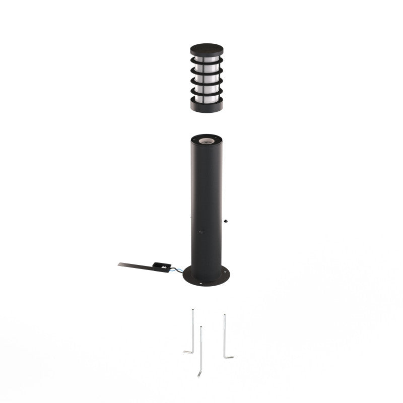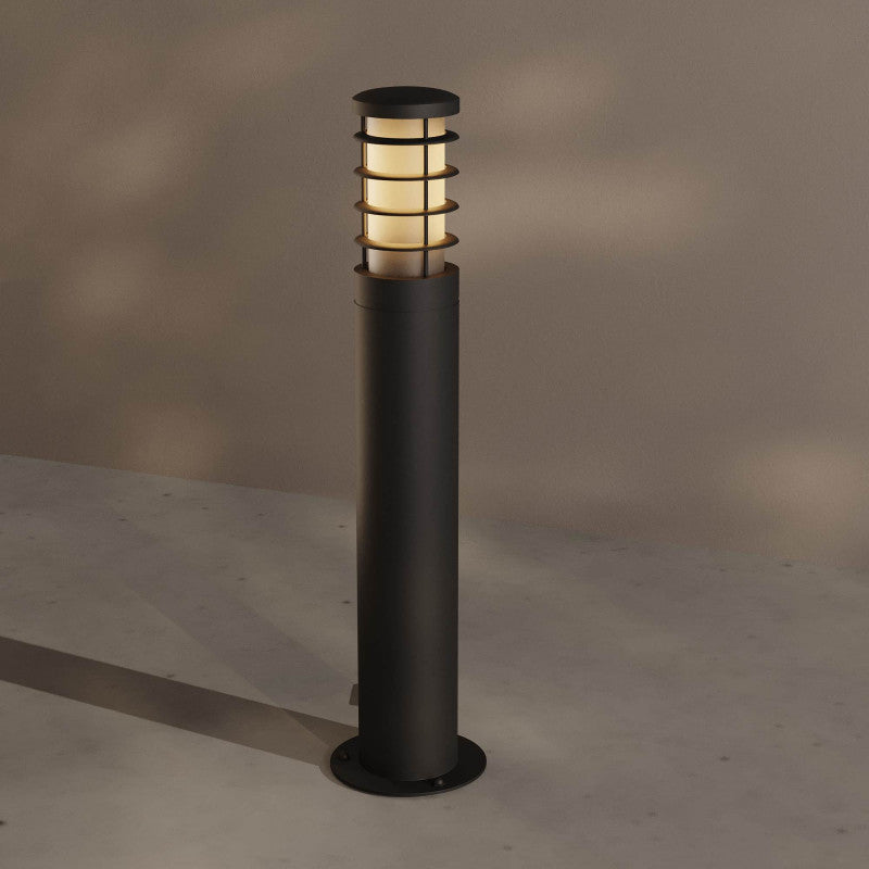 Baliza de aluminio en color negro mate y difusor opal de policarbonato. Apta para exterior con un IP54. Incluye pernos de fijación. Admite bombilla led esférica G45 con rosca e-27.