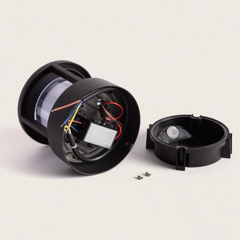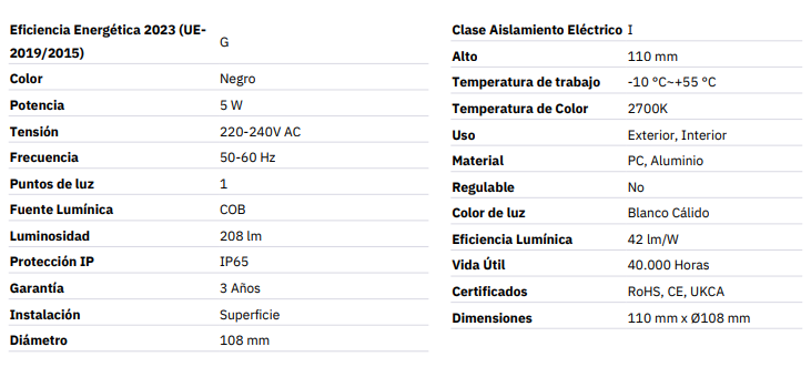 Baliza sobremuro LED de 5w, 208 lúmenes en blanco cálido 2.700ºk. Fabricada en aluminio de color negro y PC. Medidas de 11 cm de altura y 11 cm de diámetro. Apta para exterior con un IP65.
