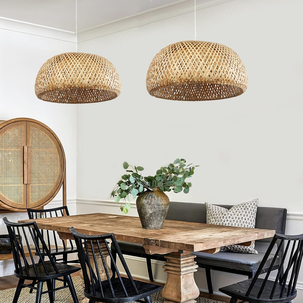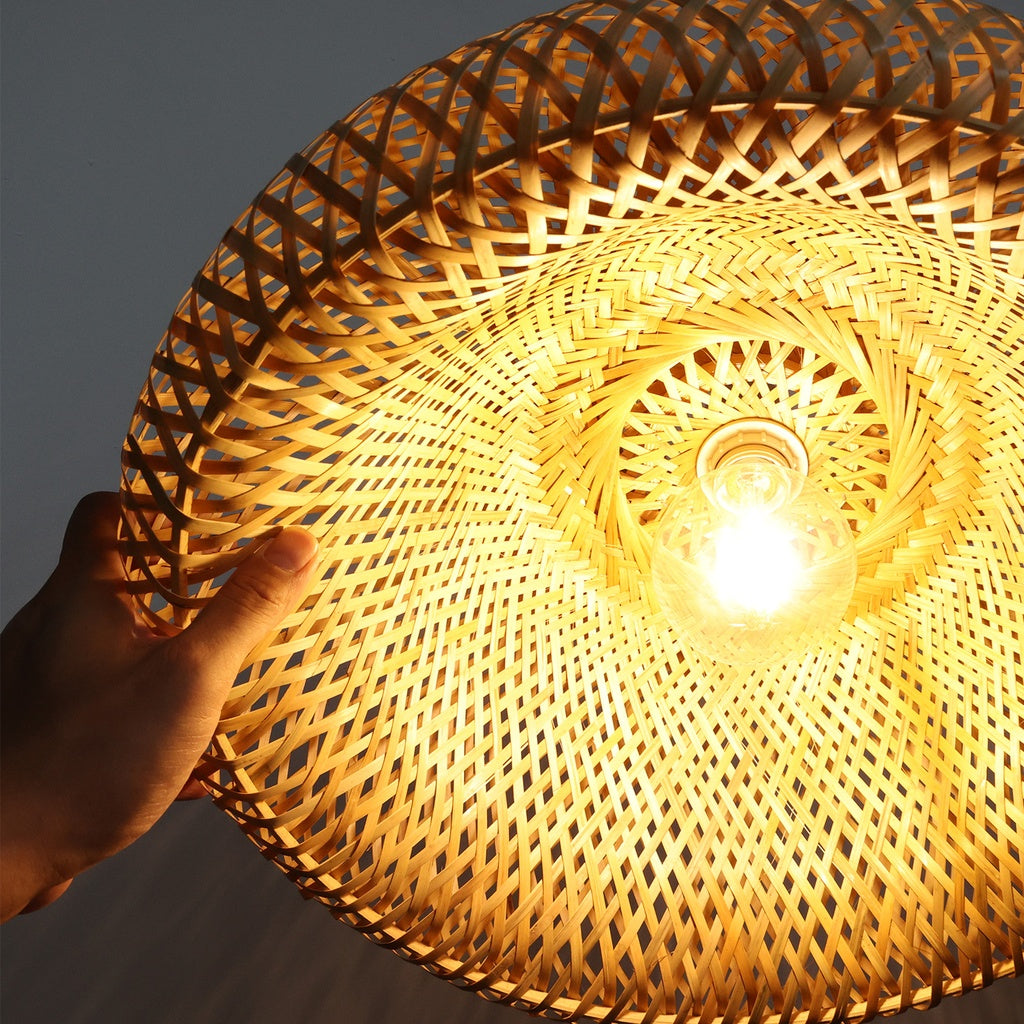 Lámpara colgante de fibras de mimbre natural, cable de cuerda marrón y florón de madera. Admite bombilla std A60 e27.