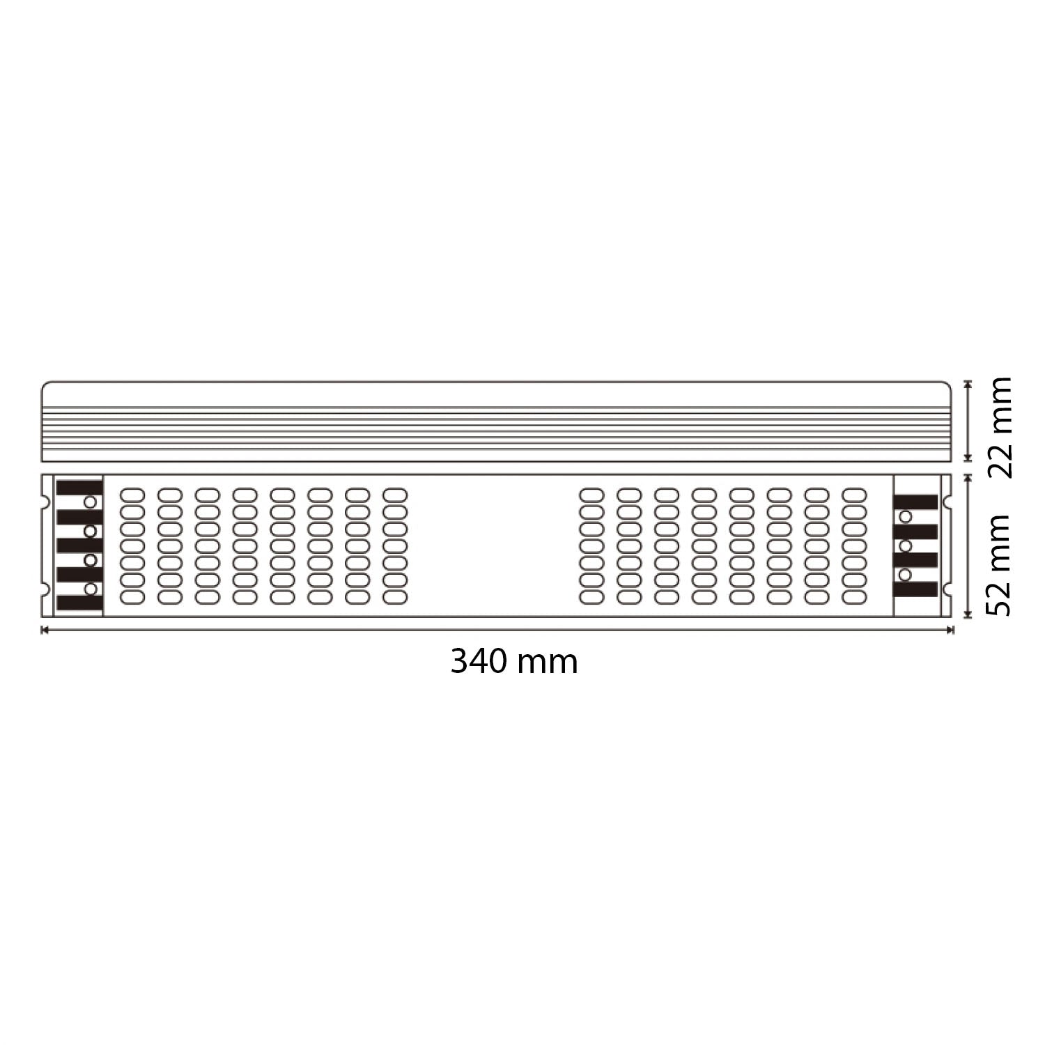 Font d'alimentació estrecha a 24v DC de tensió constant i alta eficiència. Carcassa d'alumini perforada que permet la refrigeració per convecció natural de l'aire. Ideal per a tires de leds. Certificats CE i RoHs