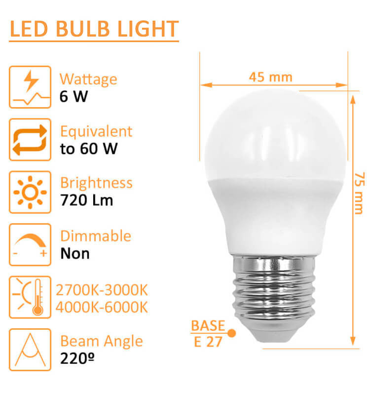 Bombilla esférica G45 rosca e-27 led 6w 550lm. Voltage de 85v a 265v